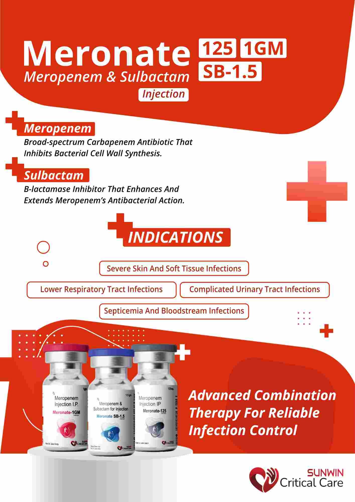 Meropenem 1000 mg + Sulbactam 500 mg is an injectable antibiotic combination used to treat severe and resistant bacterial infections.