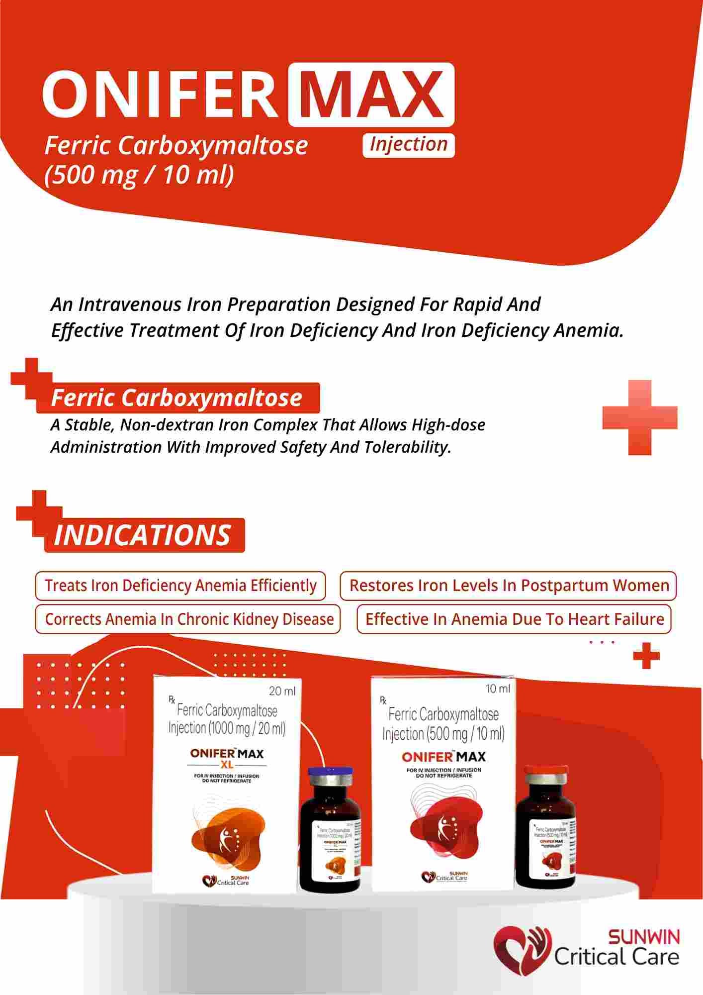 ONIFER MAX is an injectable iron preparation containing Iron Sucrose, used to treat iron deficiency anemia. It works by restoring iron levels in the body, helping in the production of healthy red blood cells and improving oxygen transport.