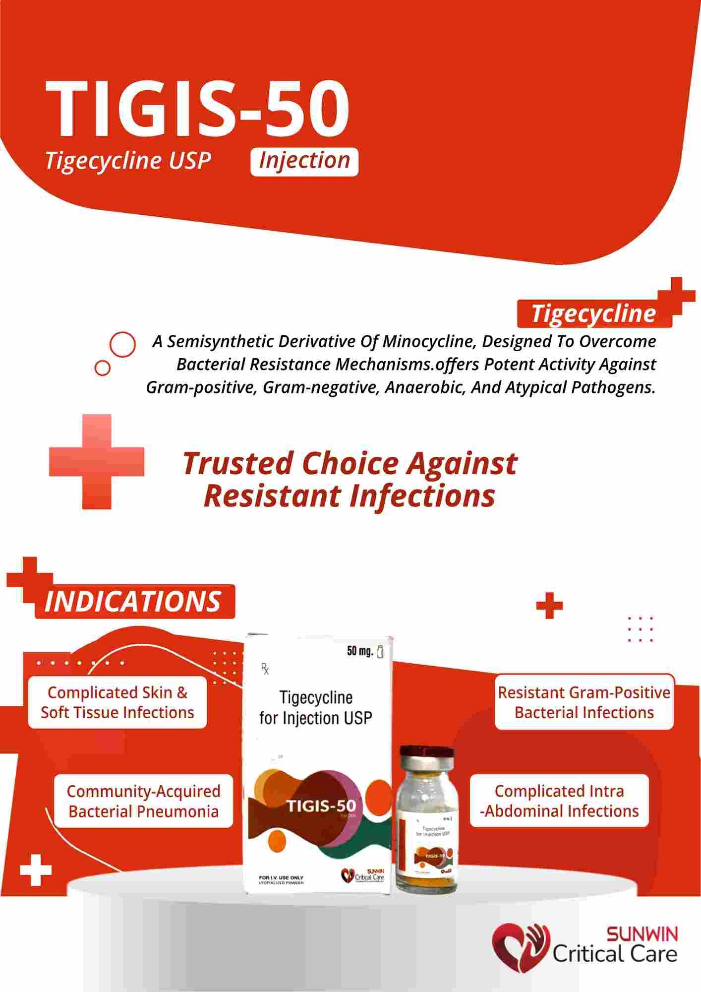 Tigecycline 50 mg injection is a broad-spectrum intravenous antibiotic used to treat complicated skin, soft tissue, and intra-abdominal infections, including those caused by multi-drug resistant bacteria. It is administered under strict medical supervision.