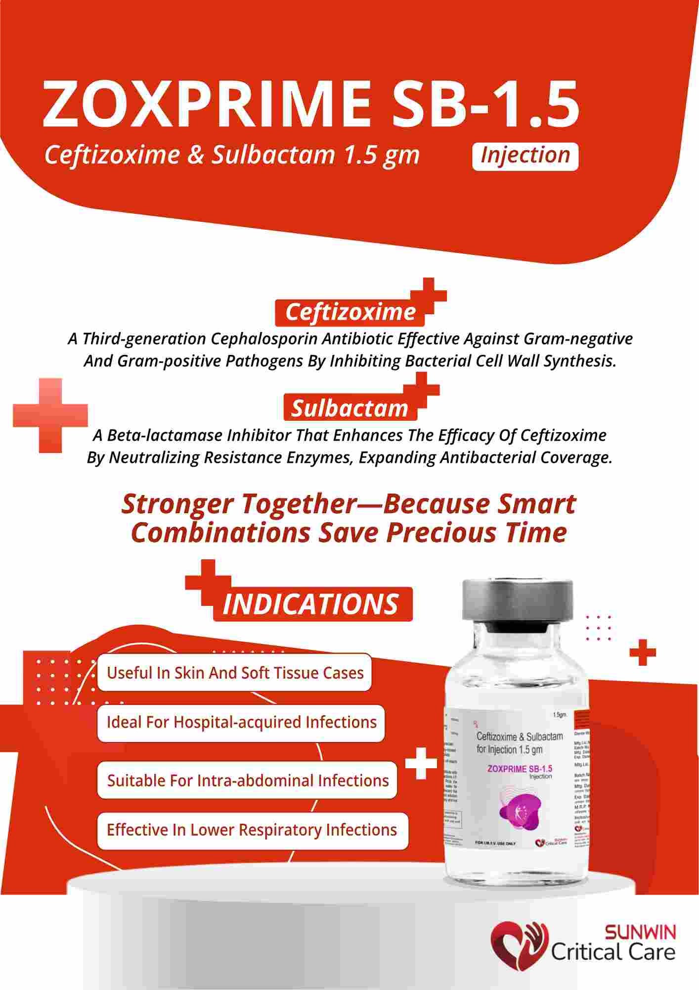 Zoxprime SB 1.5 GM is an injectable antibiotic containing Cefpodoxime 1 g + Sulbactam 0.5 g, used to treat moderate to severe bacterial infections.
